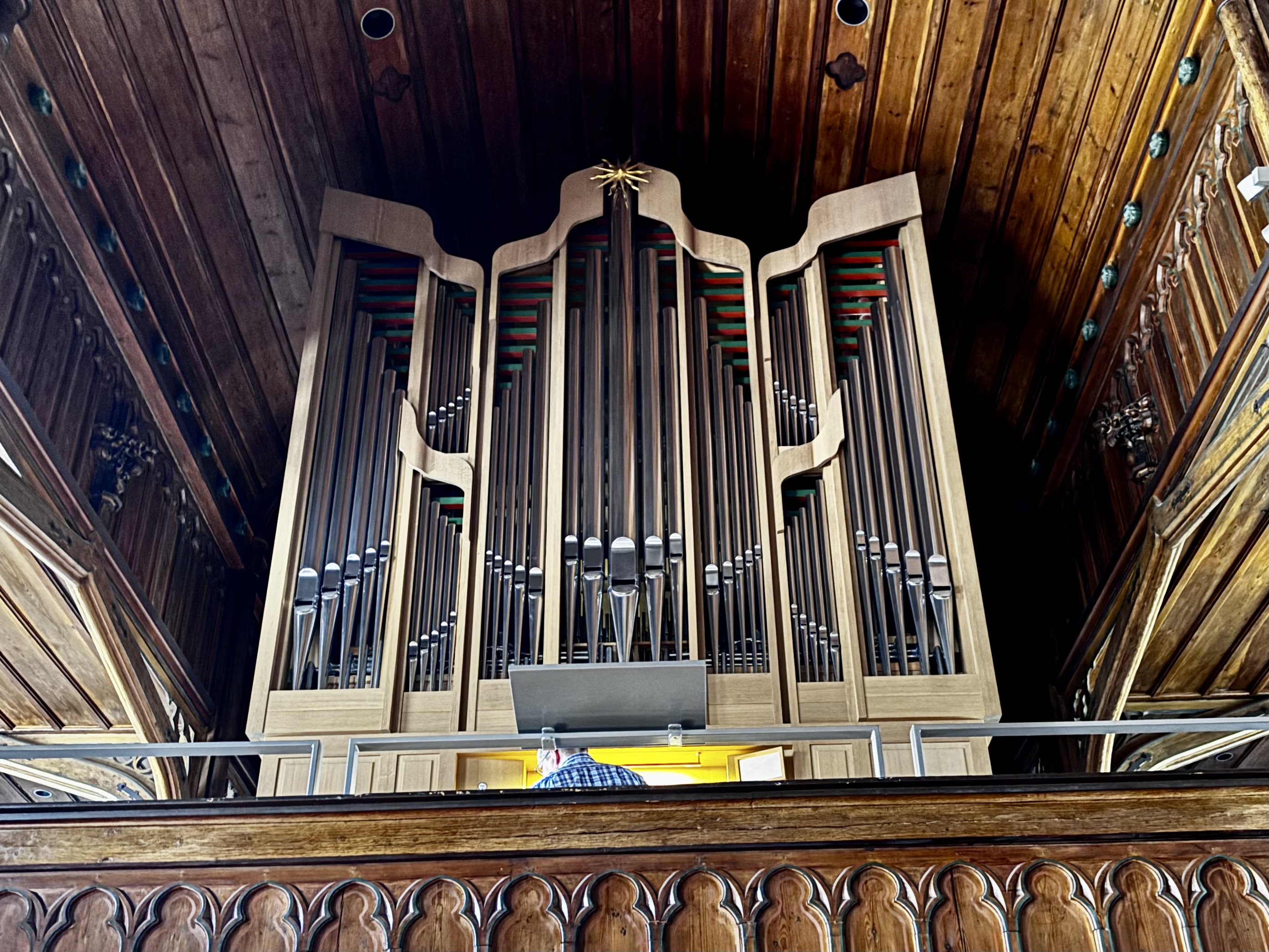 Unsere nächste Station, die ebenfalls vollmechanische Weimbs-Orgel in Trittau (II+P, 20 Register) von 2016, erinnerte mich an meine Studienzeit, in der ich etliche sehr gute Weimbs-Orgeln kennenlernte: Die Orgel der Aachener Annakirche beispielsweise, oder die Orgel in St. Anna in Hellental, wo die Firma ansässig ist. Die historischen Balthasar- bzw. Christian-Ludwig-König-Orgeln in Steinfeld und Schleiden sind von Weimbs hervorragend restauriert worden, und die Firma bewegt sich in dieser Tradition. In Trittau gefielen uns die hohe Mischfähigkeit der nichtsdestowenig sehr charakteristischen Einzelregister sowie die handwerklich makellosen Schreinerarbeiten mit einem originellen Farbspiel im Prospekt.